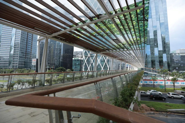 K5天桥靠近深圳湾创业广场,桥梁主体结构采用钢箱梁,主桥全长111.0米,桥面全宽6.5米(含花槽宽度),桥面净宽5.0米。