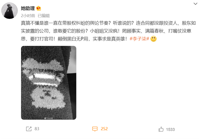 然而,就在微念公司发布上述说明一小时后,简介为“李子柒助理”的微博账号“她助理”,就发了一条微博:“真搞不懂是谁一直在带股权纠纷的舆论节奏?听谁说的?连合同都没跟投资人、股东如实披露的公司,谁敢要它的股份?”