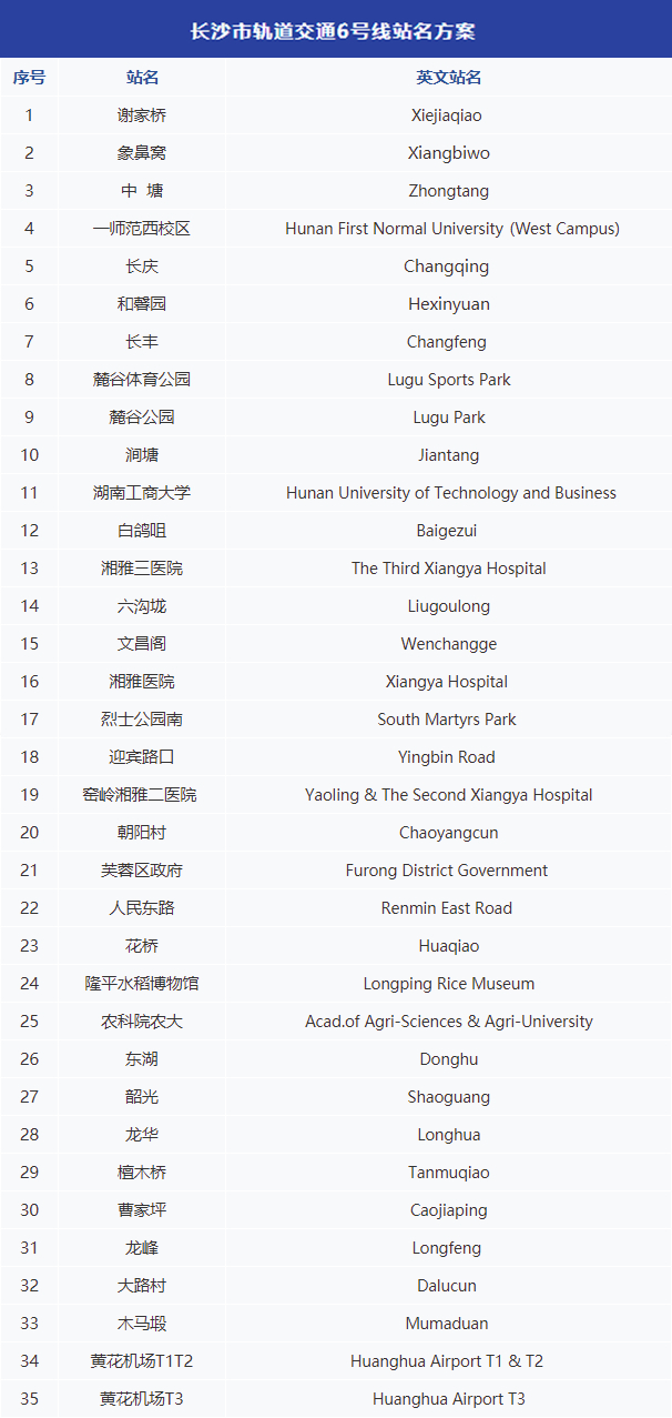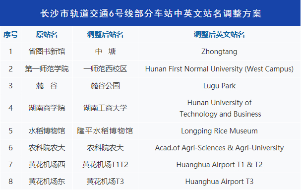 11月1日,长沙轨道交通集团发布公告,对长沙市轨道交通6号线8个车站车站中英文站名进行调整,同时公布1号线北延一期工程车站中英文站名。