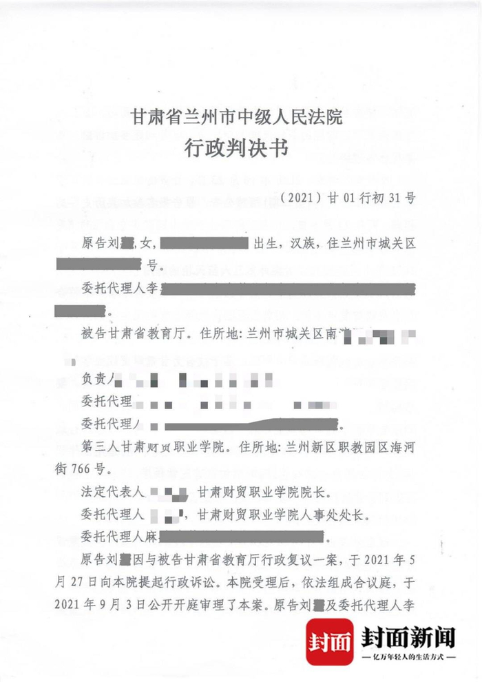 刘某告诉记者,她认为,这份行政判决书实际上是在说甘肃省教育厅本身就是甘肃财贸职业学院的主管机关,希望自己的行政复议申请最终能够得到一个答复。
