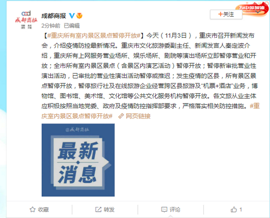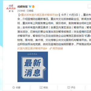 控最新情况。重庆市文化旅游委副主任、新闻发言人秦定波介绍,重庆所有上网服务营业场所、娱乐场所、剧院等演出场所立即暂停营业和开放;全市所有室内景区景点(含景区内演艺活动)暂停开放;暂停新审批营业性演出活动,已审批的营业性演出活动暂停或推迟;发生疫情的区县,所有景区景点暂停开放,暂停旅行社及在线旅游企业经营跨区县旅游及“机票+酒店”业务,博物馆、图书馆、美术馆、文化馆等公共文化服务机构暂停开放。各文旅从业主体应积极按照当地党委、政府及疫情防控指挥部要求,严格落实相关防控措施。