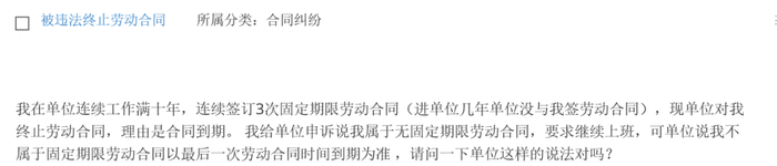 我在单位连续工作满十年,连续签订3次固定期限劳动合同(进单位几年,单位没与我签劳动合同),现单位对我终止劳动合同,理由是合同到期。我向单位申诉说,我属于无固定期限劳动合同,要求继续上班,可单位说我不属于无固定期限劳动合同,以最后一次劳动合同时间到期为准,请问一下单位这样的说法对吗?
