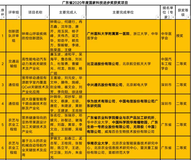 据悉,广东共有36个通用项目荣获2020年度国家科学技术奖,其中,广东省单位或个人牵头完成7项,包括国家自然科学奖二等奖1项,国家科技进步奖一等奖(创新团队)1项、二等奖5项。