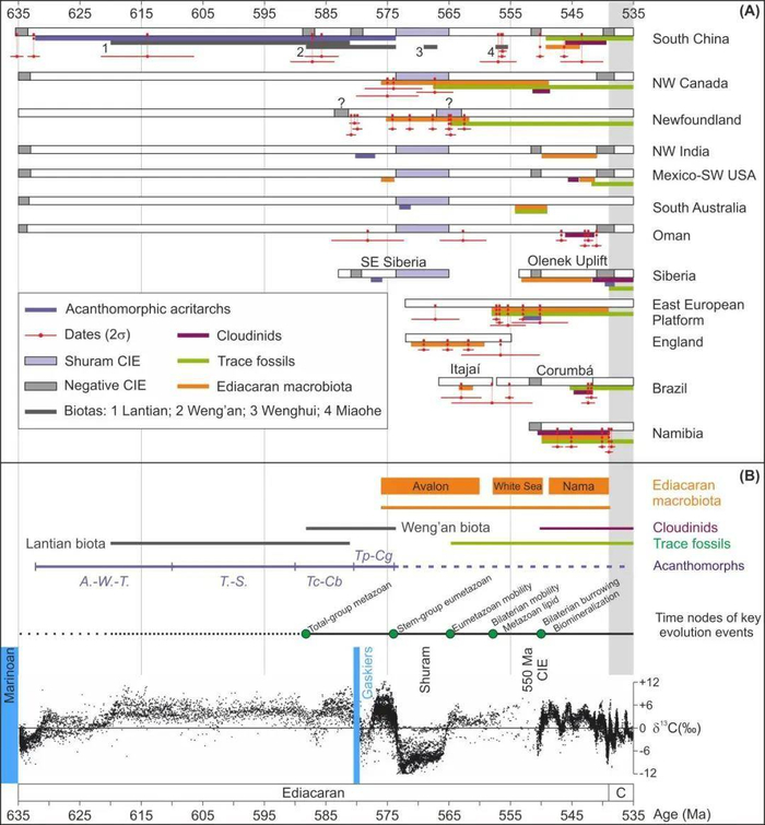 “这项工作聚焦在埃迪卡拉纪,也就距今6.35-5.39亿年前的这样一个地质时期。”论文的第一和通讯作者,英国地质调查局杨传博士告诉记者,埃迪卡拉纪是介于以极端冰期为特征的成冰纪,和以寒武纪大爆发为特征的寒武纪之间的地质年代。
