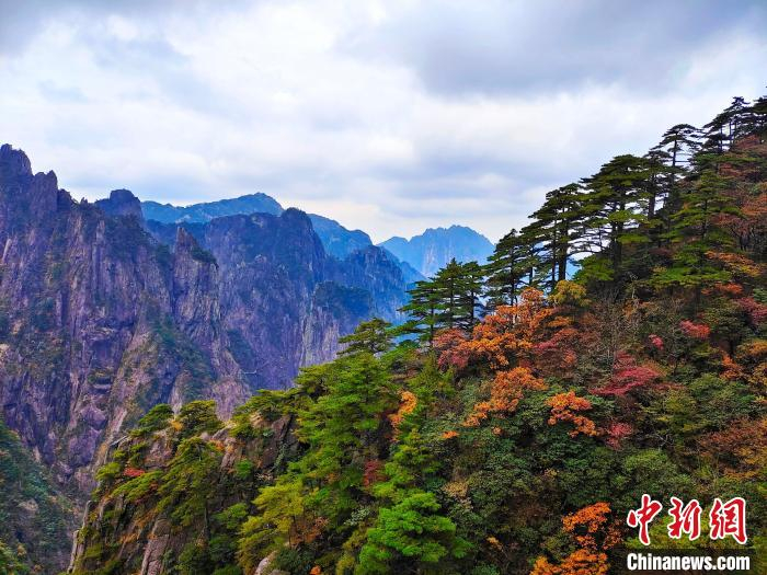 近日,安徽黄山风景区山上树木色彩斑斓,丹枫似火,草深果黄,五色纷披,呈现出火红、金黄、深绿、浅橙等不同色彩,勾勒出一个多彩的世界。(刘浩 王磊)