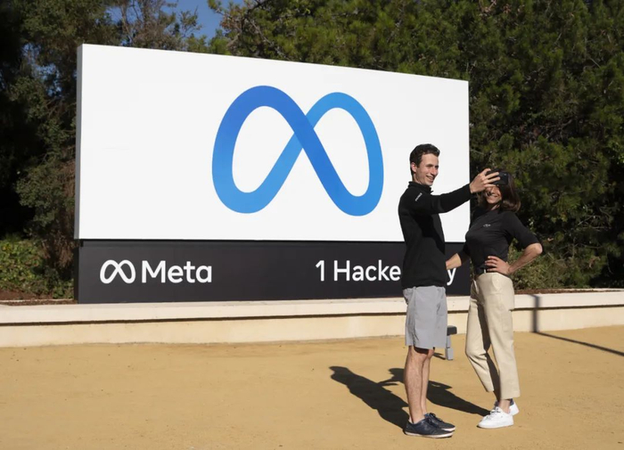 10月28日,美国旧金山湾区,人们在“元”标志牌前留影。