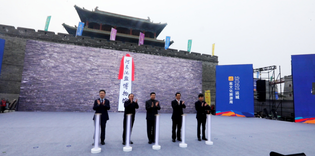 姜新文、丁小强、宋伟、李哲、孙冬青等共同按下启动键,为河东池盐博物馆开馆揭牌。