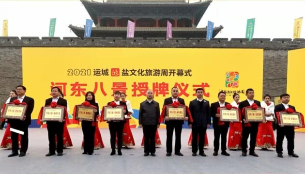 刘永生和王立刚为盬池溢彩、祖庙飞龙等河东八景授牌。