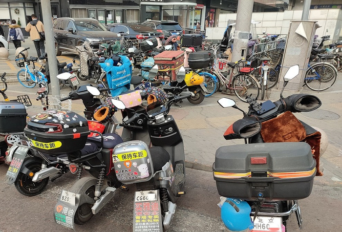 与两个月前,现在最大的区别就是路边所停电动车的车牌颜色不同。因为当时尚处于《北京市非机动车管理条例》所规定的超标电动车3年过渡期,而超标车往往速度更快,因此更受外卖骑手的青睐。当时路边停着的外卖车,一多半都是橙色临牌的超标车。而现在,因为过渡期已满,这里停着的电动车全都已经换成了白牌的新国标车。