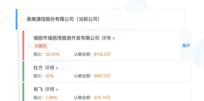 据天眼查信息显示,奥维通信的大股东为瑞丽市瑞丽湾旅游开发有限公司,持股23.43%。而单川是瑞丽市瑞丽湾旅游开发有限公司的疑似实际控制人,持股8.83%。
