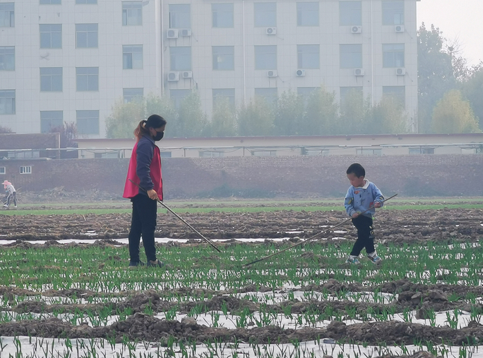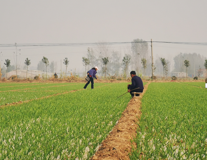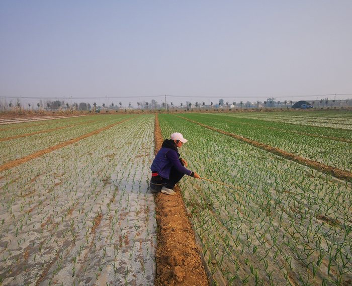 走在白桥镇,除了地头里与时间“博弈”的蒜农,在一些早播的地里,绿油油的蒜苗前又有着另一份辛勤。