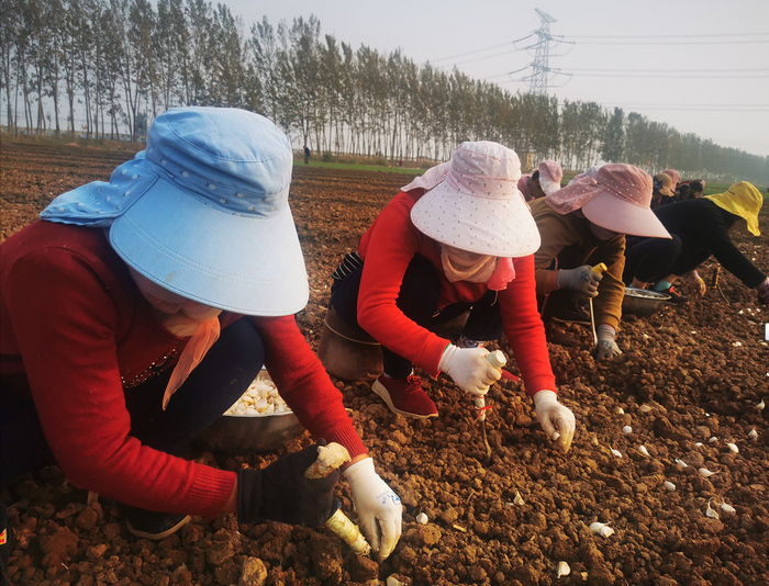 张芳雇佣的栽蒜工人们,多为本村或是邻村的妇女。她们大多都是种完了自家的地,再赶着出来赚些额外的收入,熟练、精准、手脚麻利,是她们被选中的重要标准。