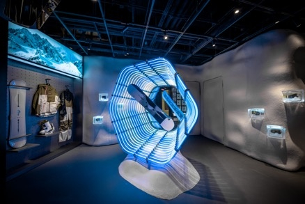 位于SKP-S 三楼的BURTON SKP-S独立门店以“FUTURE TRAVEL”为设计概念,整体以JAKE BLUE为主色调。入口处,BURTON的雪板悬浮在散发蓝光的冰洞口,踏上滑雪板,穿过深邃的冰洞岩层,时光穿梭到了未来世界。“未来世界”,是由延绵起伏的白色雪山和蓝色的冰川冰组成的冰雪世界,墙壁上印刷着“WE RIDE TOGETHER”的精神倡导,身穿JAKE BLUE制服的未来人以BURTON滑雪板为交通工具,带着大家一起前往BURTON打造的未来世界。
