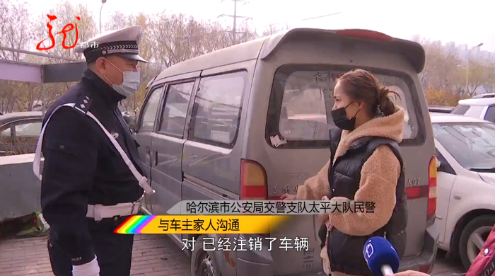 记者拨打了122报警电话,很快民警赶到了现场,经过查询,这台车已经被注销。交警电话联系了车主,随后车主的家人来到了现场。交警又来到这四台被拆解的汽车旁,电话联系了汽车修配厂的店主。走访中,交警又发现了一台没有牌照的黑色轿车,车胎已经没气。交警给这辆黑色轿车下达了告知书,限定车主周一前把车辆挪走。