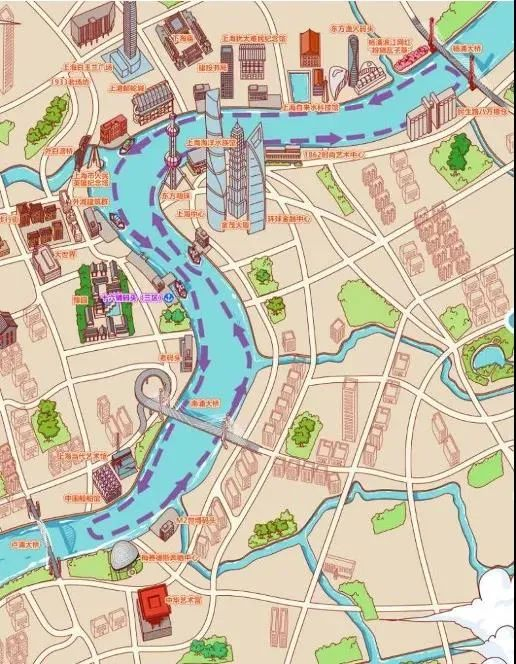 航线:十六铺码头—南浦大桥—梅赛德斯奔驰文化中心—卢浦大桥(调头)—滨江大道—上海中心—上海国际会议中心—东方明珠—秦皇岛路码头(调头)—北外滩—白玉兰大厦—外白渡桥—外滩万国博览建筑群—十六铺码头