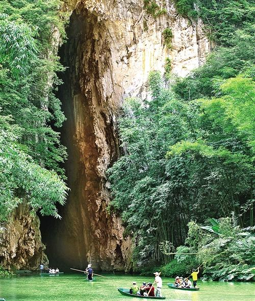 走进广南县西北部的深山中,一条潺潺小河为游客引路,抵达坝美景区的入口处时,河面变得宽阔起来,对面的山崖中出现一个狭长山洞,清清河水从洞内缓缓流淌出来。