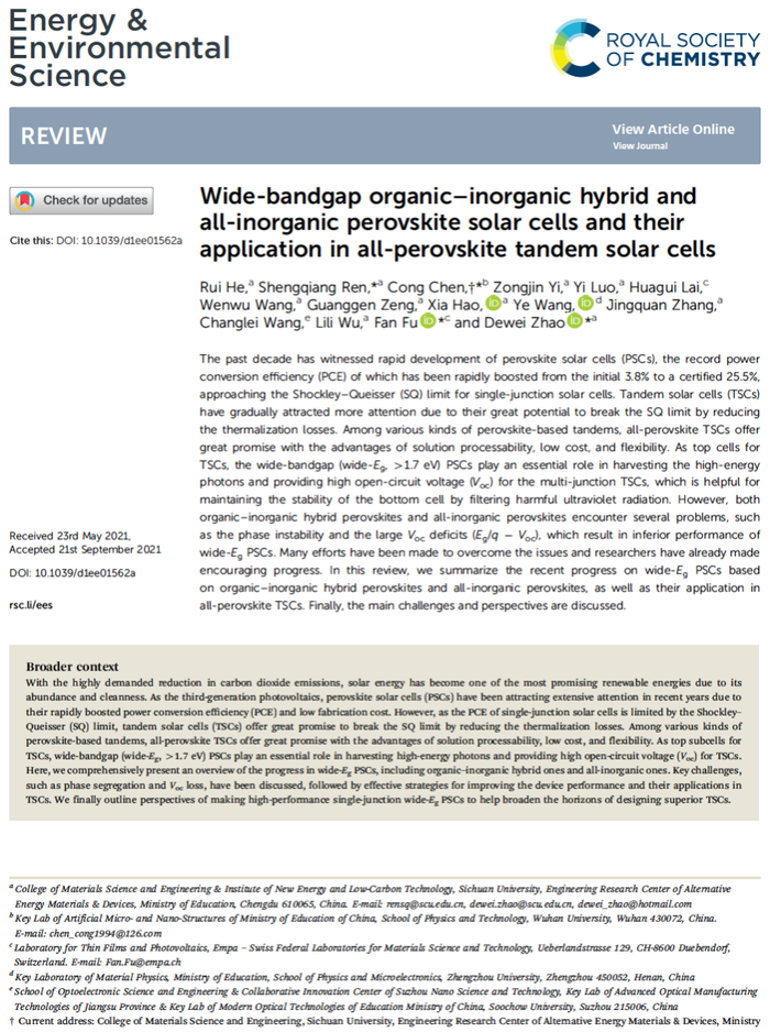 近日,材料科学与工程学院太阳能材料与器件课题组与瑞士联邦材料科学与技术研究所(Empa)合作,全面地总结了有机无机杂化宽带隙钙钛矿和全无机宽带隙钙钛矿及其在全钙钛矿叠层太阳电池中应用的研究进展,相关成果“Wide-bandgap organic–inorganic hybrid and all-inorganic perovskite solar cells and their application in all-perovskite tandem solar cells”以四川大学为第一单位发表在国际期刊Energy & Environmental Science上。该论文的第一作者为四川大学材料科学与工程学院2020级博士研究生贺锐。通讯作者为四川大学材料科学与工程学院任胜强专职博士后、赵德威特聘研究员和瑞士Empa付帆博士(研究员)、武汉大学陈聪博士(现四川大学材料科学与工程学院特聘副研究员)。
