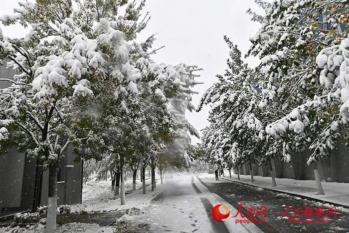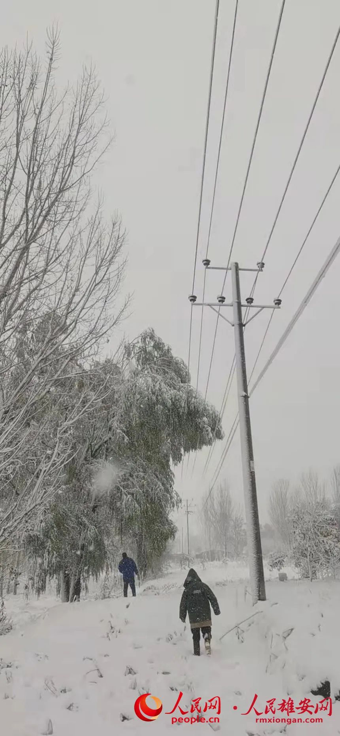 安新县大淀头村志愿者清扫积雪。端村镇供图11月7日,国网雄安新区供电公司同口供电所员工冒雪清理同口512线路旁树上的积雪。李亚琨摄