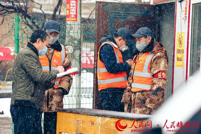 雄县双堂乡疫情防控人员在风雪中值守。张瑜拍摄
