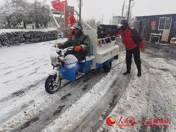 雄安集团生态建设公司环卫作业队伍全体出发,对容东片区各主干道进行除雪清扫,对积雪较厚区域进行固体融雪剂撒布,并对各组团重点区域和公共卫生间门前、人行道等进行大面积人工除雪,确保出行方便和交通安全。雄安集团生态建设公司供图