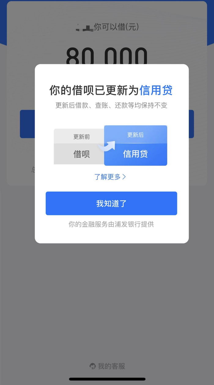 11月7日,有部分网友发现,自己的“借呗”变为了“信用贷”,且明确提示由银行提供服务。