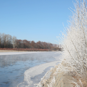 在呼中大桥下的呼玛河两岸,或俯或倒或挺拔的红柳、白杨、灌木丛,都挂满了洁白的冰霜,似银枝玉条、似玉树琼花,格外精致。
