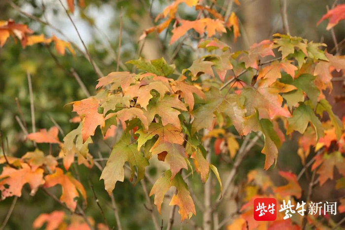 扬子晚报网11月9日讯(记者 徐昇)随着气温骤降,金色、红色成为南京的主色调。11月9日,扬子晚报/紫牛新闻记者来到南京中山植物园发现,平日里不显眼的树叶已经变得色彩斑斓,红黄相间的乌桕、金色的银杏、红艳艳的槭树……各种彩叶树种正展现它们的美丽,成为植物园的主角。