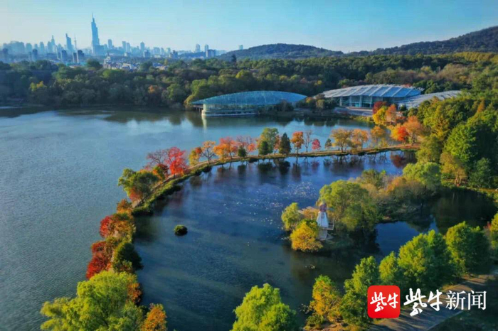 植物园南园前湖畔的乌桕堤也已经迎来最佳观赏期。乌桕堤又名“月牙堤”,仿佛一弯月牙落在前湖碧波之中,小道两侧种植大量乌桕树,每年十月下旬开始,乌桕树的绿叶就变为金黄、火红,在湖面留下斑斓的倒影。