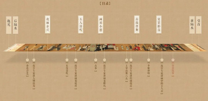 全图分“听乐”、“观舞”、“暂歇”、“清吹”、“散宴”5段。