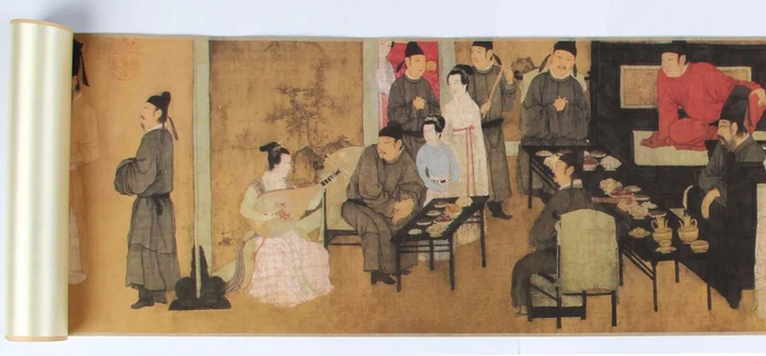 细致还原了宴会上弹丝吹竹、清歌艳舞、主客揉杂、调笑欢乐的热闹场面。