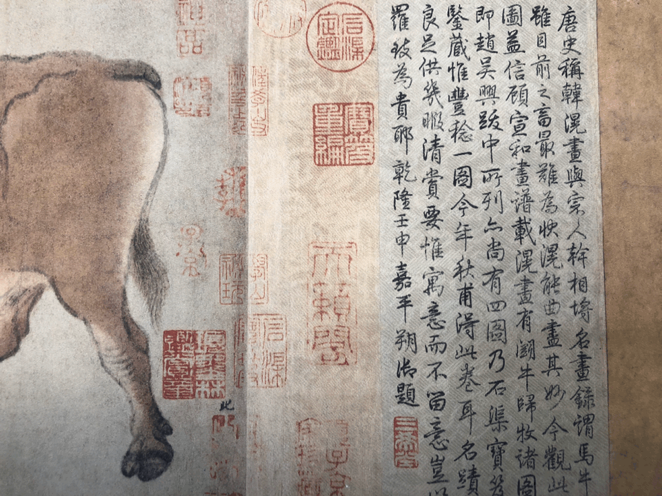 它是唐代画家、宰相韩滉的传世孤本,创作至今1200年,有赵孟頫、孙弘、项元汴、弘历、金农等十四家题记。
