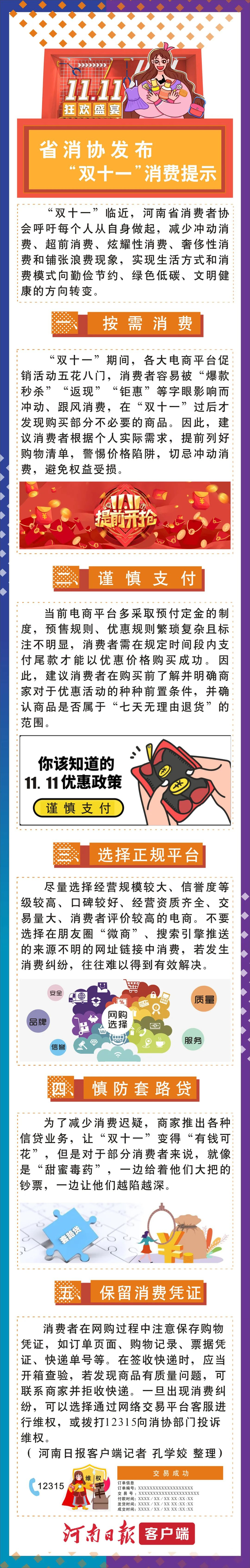 同时,河南省市场监管局提醒广大消费者,“双十一”期间应当理性消费,提高维权意识,遇到侵权行为应当及时向电商平台或通过“12315”平台投诉举报,运用法律武器维护自身合法权益。