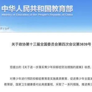 近日,中国教育部日前对全国政协《关于进一步落实青少年抑郁症防治措施的提案》进行了答复,其中明确将抑郁症筛查纳入学生健康体检内容。