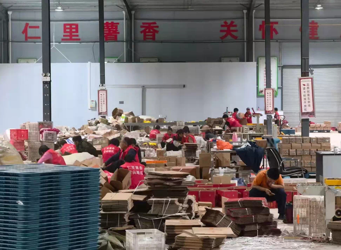 济南商河县的一个地瓜仓库内,当地农户手上的活就没停过。一个接一个的地瓜被装进快递盒,即将发往全国各地。