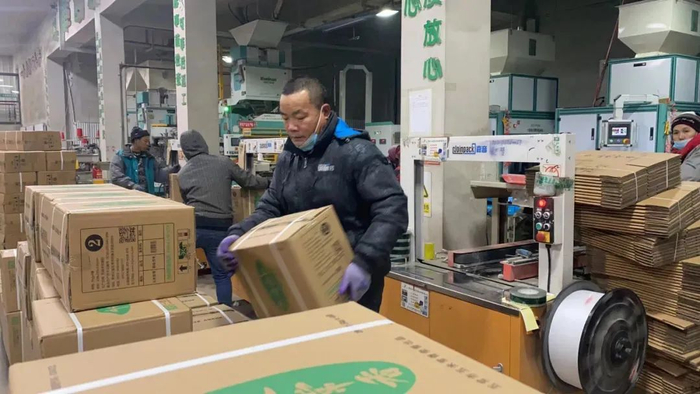进入11月,五常的夜晚温度基本都低于零度以下。晚上十点,五米常香旗舰店的装卸车间氛围火热,工人刘长春忙得满头大汗。