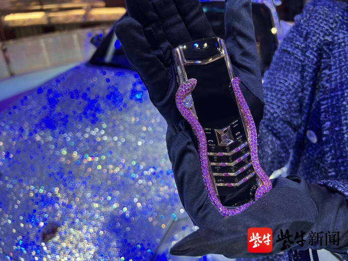 新款4G“眼镜蛇”Signature V,由388个极致奢华珍稀零件打造而成:蛇身镶有439颗红宝石,蛇眼镶嵌2颗祖母绿,华美优雅。每一个按键都饰以珐琅,细节精致度拉满。戴上手套,扬子晚报/紫牛新闻记者触摸到了“天价”手机的质感,机身很轻,拿在手里拍照便是最闪耀的配饰。