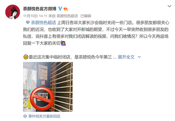 “最近这次集中临时闭店,是茶颜悦色今年第三次集中临时闭店。第一次是年初的就地过年,第二次是七月底疫情反复,第三次就是最近被网友关注到的。”茶颜悦色方面在微博中坦言,长沙已有七八十家临时闭店了,之前的密集布点在长沙的城市发展中赚到了红利,但也要承担人流减少带来的结果。