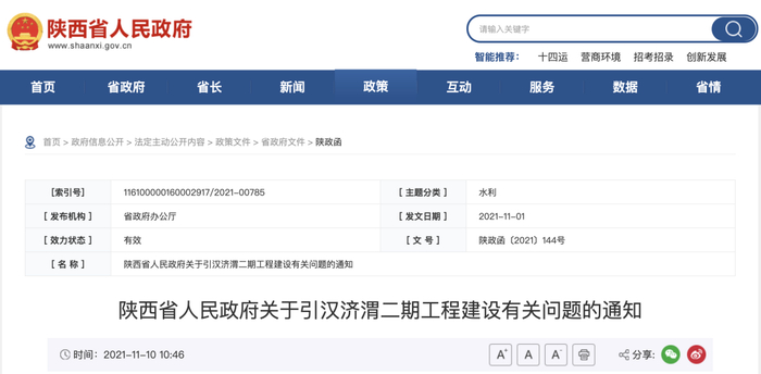 原标题:陕西省人民政府关于引汉济渭二期工程建设有关问题的通知