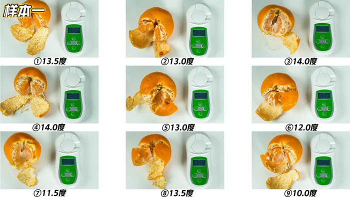 我特意拆了一箱包装好的蜜桔,用甜度仪挨个测了甜度:27个桔子,甜度基本在12.5度以上,个别甜度还能达到15度,比蜂蜜还要甜!