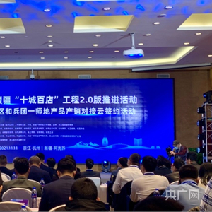 央广网杭州11月11日消息(记者俞安懿 通讯员叶锡挺)11月11日,浙江市场援疆“十城百店”工程2.0版推介会暨阿克苏地区和兵团一师地产品产销对接云签约活动在浙江杭州和新疆阿克苏两个分会场同时进行。会上,25家十城百店运营企业签订近8万吨苹果、核桃、红枣、牛羊肉等阿克苏地区和兵团第一师阿拉尔市农产品,签约金额11.8亿元。
