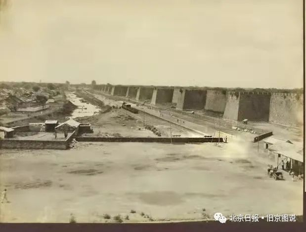 1901年在前门东侧的城墙上往东拍摄的照片。正阳门东火车站已经投入使用,远处可隐约看到崇文门城楼,没有箭楼,因为箭楼一年前已被英国人轰毁。在照片左侧北京内城城墙的两个墩台之间可以看见立着一个指示牌,那里就是英国人拆出来的水关门。