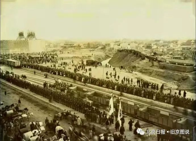 1902年在崇文门瓮城里的东南角朝西北方向拍的照片。当时火车正在通过崇文门,老百姓在两侧等待通行。通过照片可以看到崇文门瓮城里边西北角的关帝庙已经没有了,是在铺铁路的时候被拆毁的。