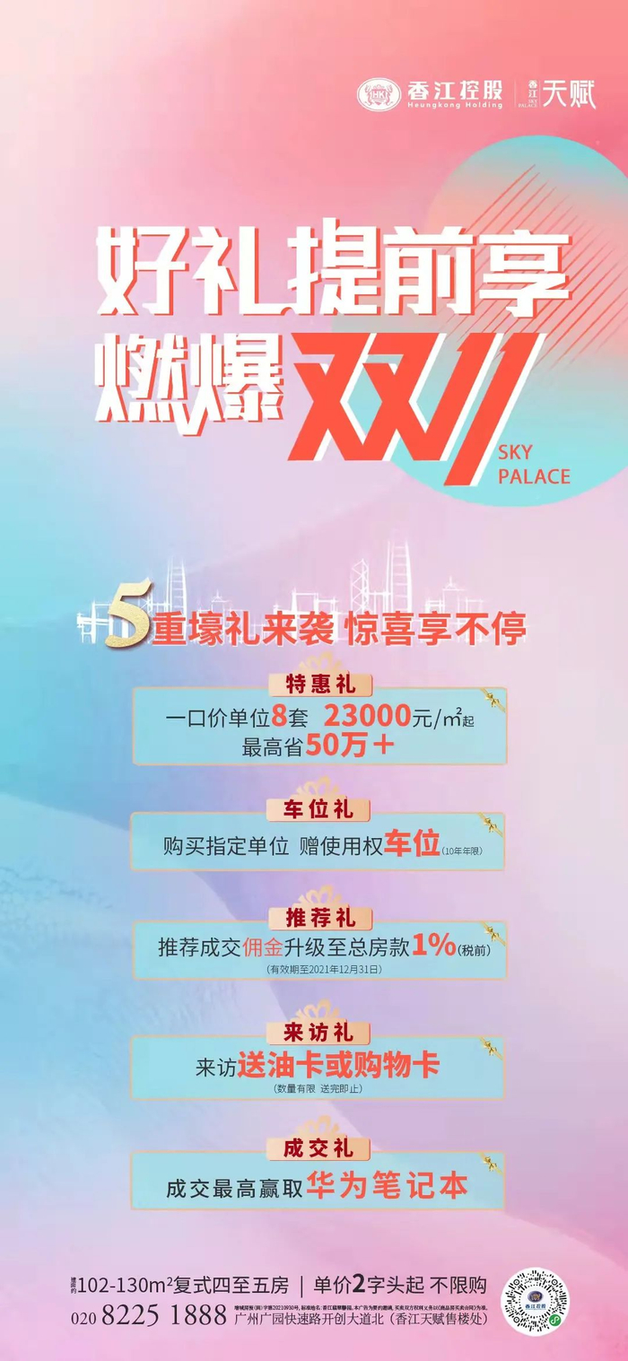 香江天赋作为香江地产重金打造的成熟大盘,目前推出中轴楼王单位,正值“双十一”来袭,香江天赋为回馈大众,现推出5重惊喜豪礼,各种福利活动、优惠折扣、惊喜豪礼齐聚。想要上车的请抓紧最后机会。