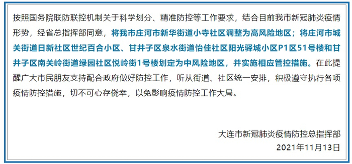 按照国务院联防联控机制关于科学划分、精准防控等工作要求,结合目前大连市新冠肺炎疫情形势,经省总指挥部同意,将大连市庄河市新华街道小寺社区调整为高风险地区;将庄河市城关街道日新社区世纪百合小区、甘井子区泉水街道怡佳社区阳光驿城小区P1区51号楼和甘井子区南关岭街道绿园社区悦岭街1号楼划定为中风险地区,并实施相应管控措施。