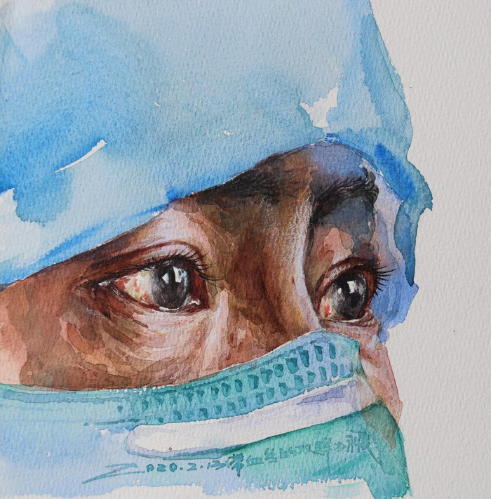 王永晟说,最初将画集命名为“最美天使”,是因为离病毒最近的就是医护人员,他们在战疫前线,连续多日与病毒艰难较量、与死神顽强抗争。社交媒体上,布满血丝的双眼、被防护服捂出的皮肤褶皱、被口罩勒出的印痕……这些给了他灵感,由此他特意创作了《带血丝的双眸》。