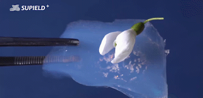 隔冷隔热超厉害,用火焰隔着气凝胶烧花,花朵完好无损。