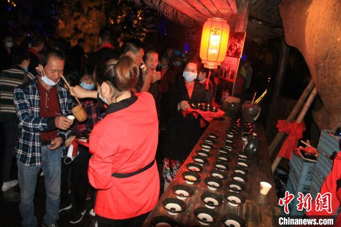 中新网清远11月15日电 (记者 程景伟)立冬过后,广东各地尤其是粤北地区的天气逐渐寒冷。位于粤北地区的广东清远英德宝晶宫,溶洞里储藏了三年之久的数万斤美酒,连日来逐渐开坛启封,不少游客在欣赏溶洞奇观之余,得以一品洞藏美酒。“入冬后天一下子就冷了,喝碗酒感觉很暖身”,有游客说。
