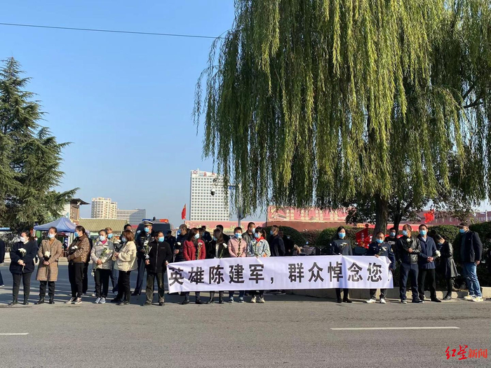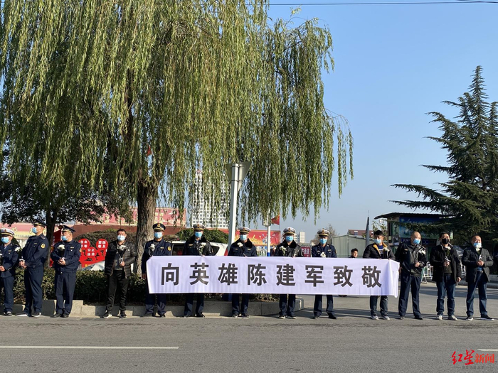 红星新闻记者在蒙城客运中心站看到,该县交通局工作人员以及附近群众早上7点多即来到客运站门口路边,8时许,他们手持鲜花,拉起送别他的“向英雄陈建军致敬!”等条幅。9点15分,陈建军遗体的送别车队从客运中心站门前的鲲鹏路通过。陈建军不幸牺牲后,引发各界哀思,群众晚上自发到案发地悼念他。