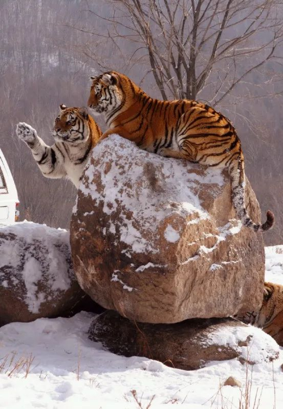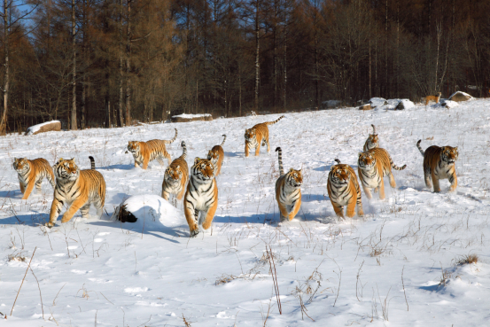 也可以感受到成群东北虎躺卧在皑皑白雪“互谈心事”的百般惬意,还可以领略到虎牛相斗、群虎扑食的惊险刺激。