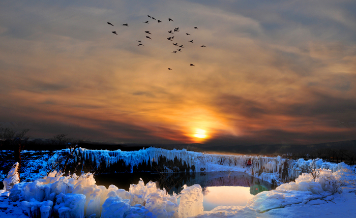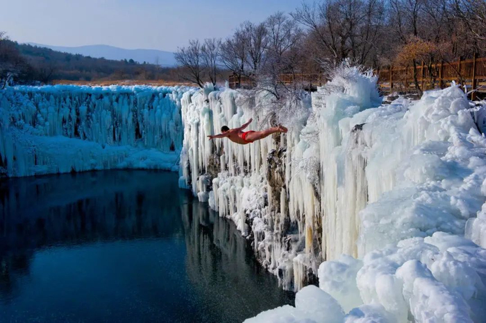 在冰凌交错、银装素裹的纯净世界里,世界吉尼斯纪录创造者——中国悬崖跳水奇人狄焕然,在零下二十多度的镜泊湖吊水楼冰瀑上,伸展双臂,凌空一跃,扑向不结冰的黑龙潭水面,跳入落差近20米的水中,成为镜泊湖景区冬季的一道独特景观。